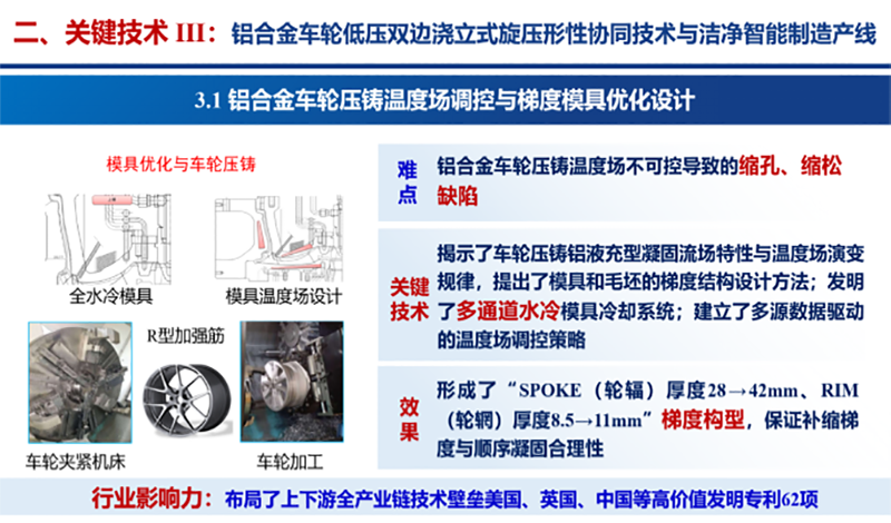三是發(fā)明了鋁合金車輪低壓雙邊澆立式旋壓新方法,突破了形性協(xié)同導(dǎo)向的鋁合金車輪壓鑄智能溫控模具優(yōu)化技術(shù),構(gòu)建了鋁合金車輪潔凈切削自適應(yīng)工藝策略與智能檢測產(chǎn)線,提升車輪抗拉強度、延伸率,降低夾渣報廢率。